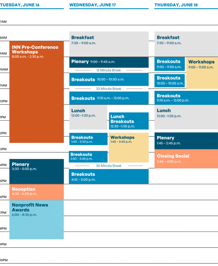 INN Days: The conference will begin with a plenary and reception on the afternoon of Tuesday, June 16. It will include a full day of programming on Wednesday, June 17, and end by 4 p.m. on Thursday, June 18.